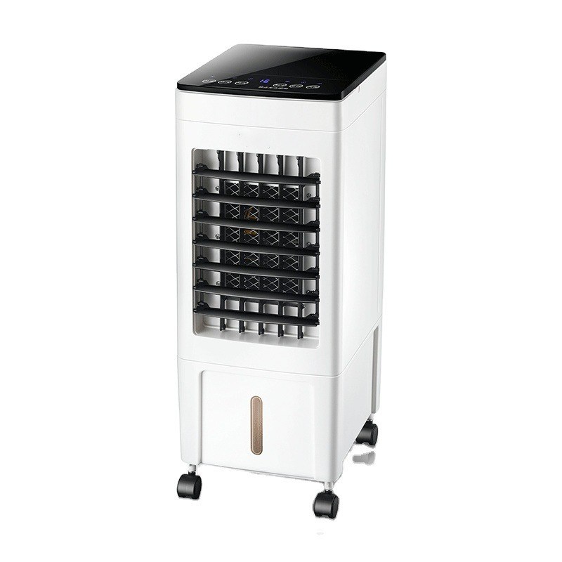 Le ventilateur de climatisation utilise des molécules d'eau pour refroidir l'évaporation.Lorsqu'il fonctionne, l'eau du réservoir d'eau est pompée vers le rideau de filtre vert par la pompe à eau.Puis l'eau est versée dans le rideau.Le moteur intémale tourne pour aspirer l'air à travers le rideau et l'air chaud qui passe à travers le rideau est absorbé par l'eau, fait vent froid.